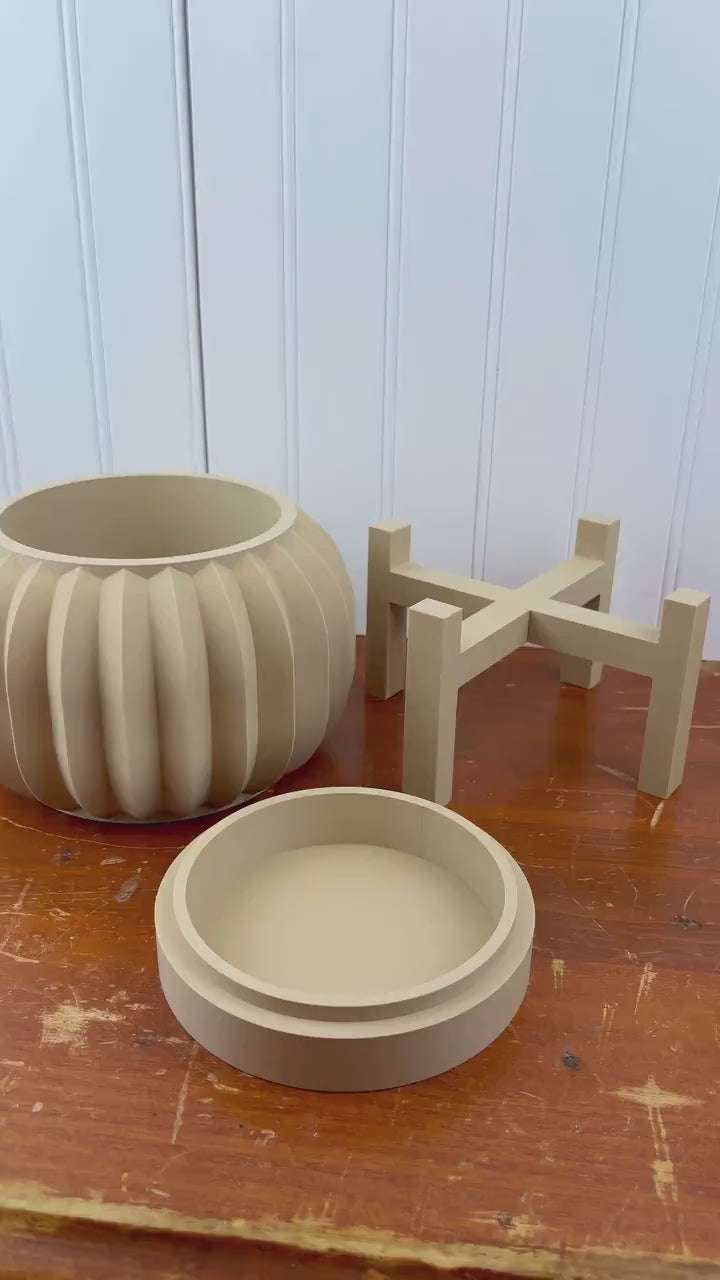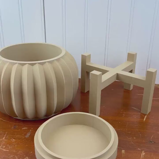 The planter is 3D printed using eco-friendly, biodegradable PLA plastic filament. 3D printing is done by printing layer upon layer of filament to build up and create the print.