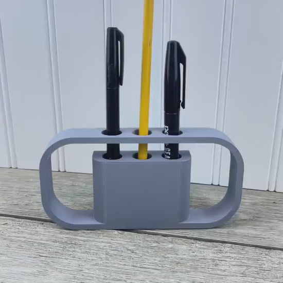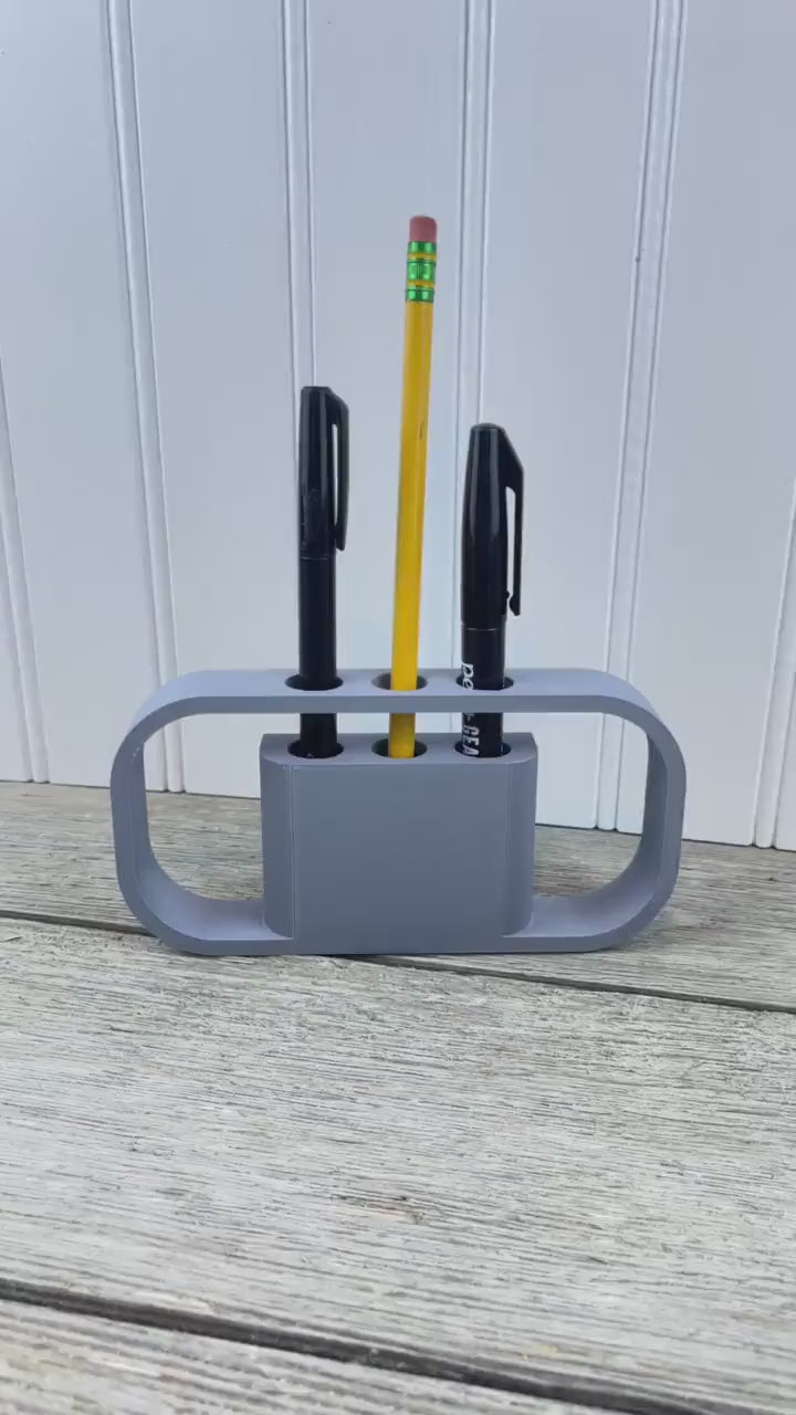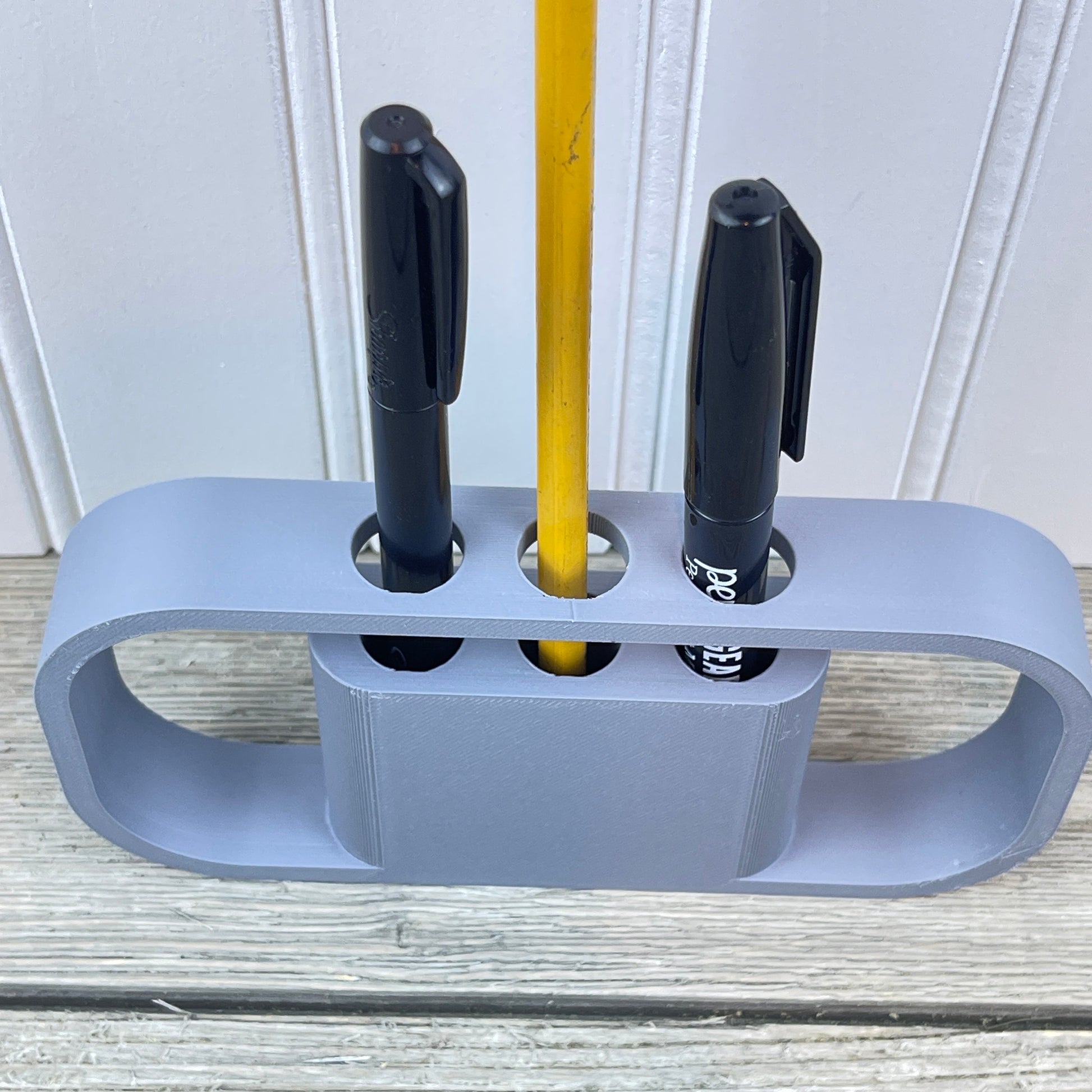Add some style to your desk with this modern style pen holder. You gotta have pens/pencils on your desk, why not store them in style. Pen holder is 3D printed and holds three pens/pencils.