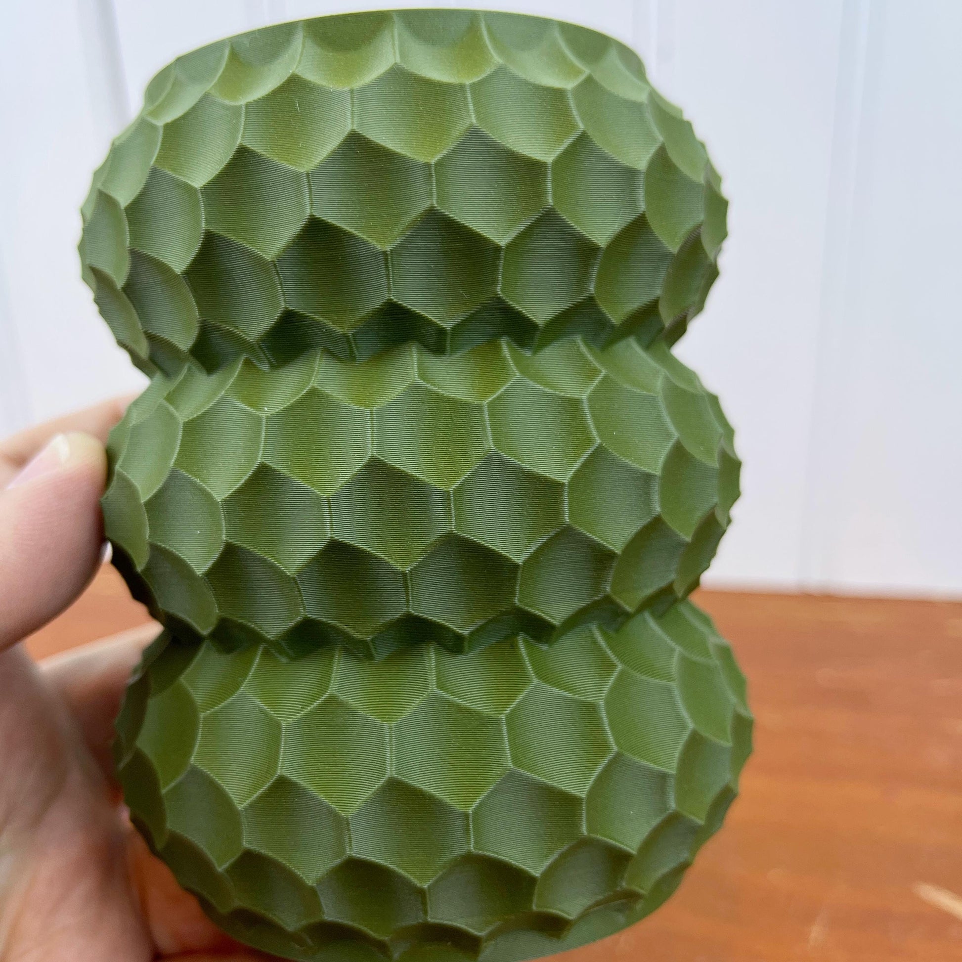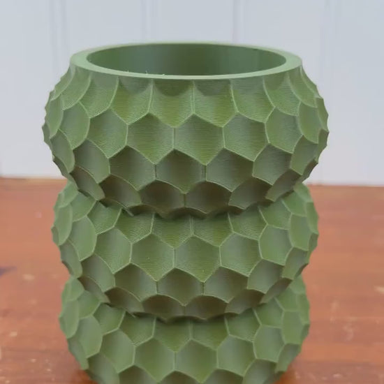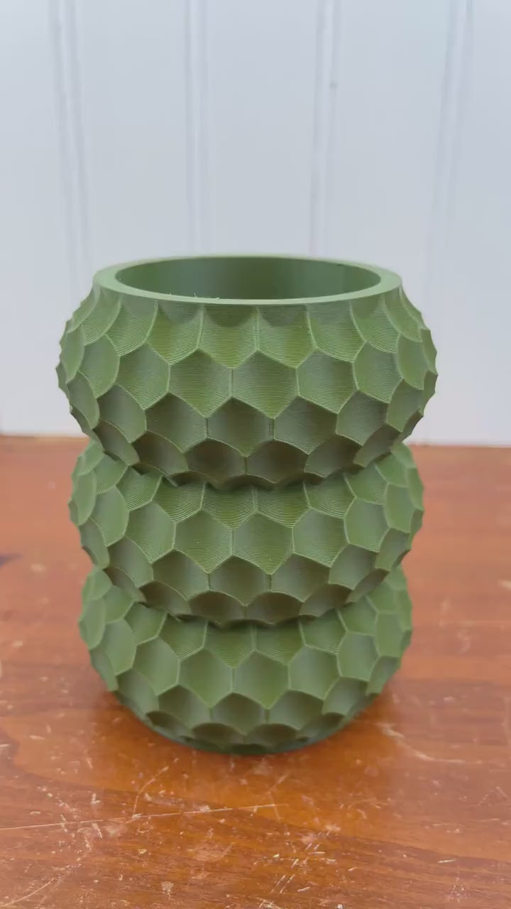 The pen holder is 3D printed using eco-friendly, plant based biodegradable PLA plastic filament. 3D printing is done by printing layer upon layer of filament to build up and create the print.