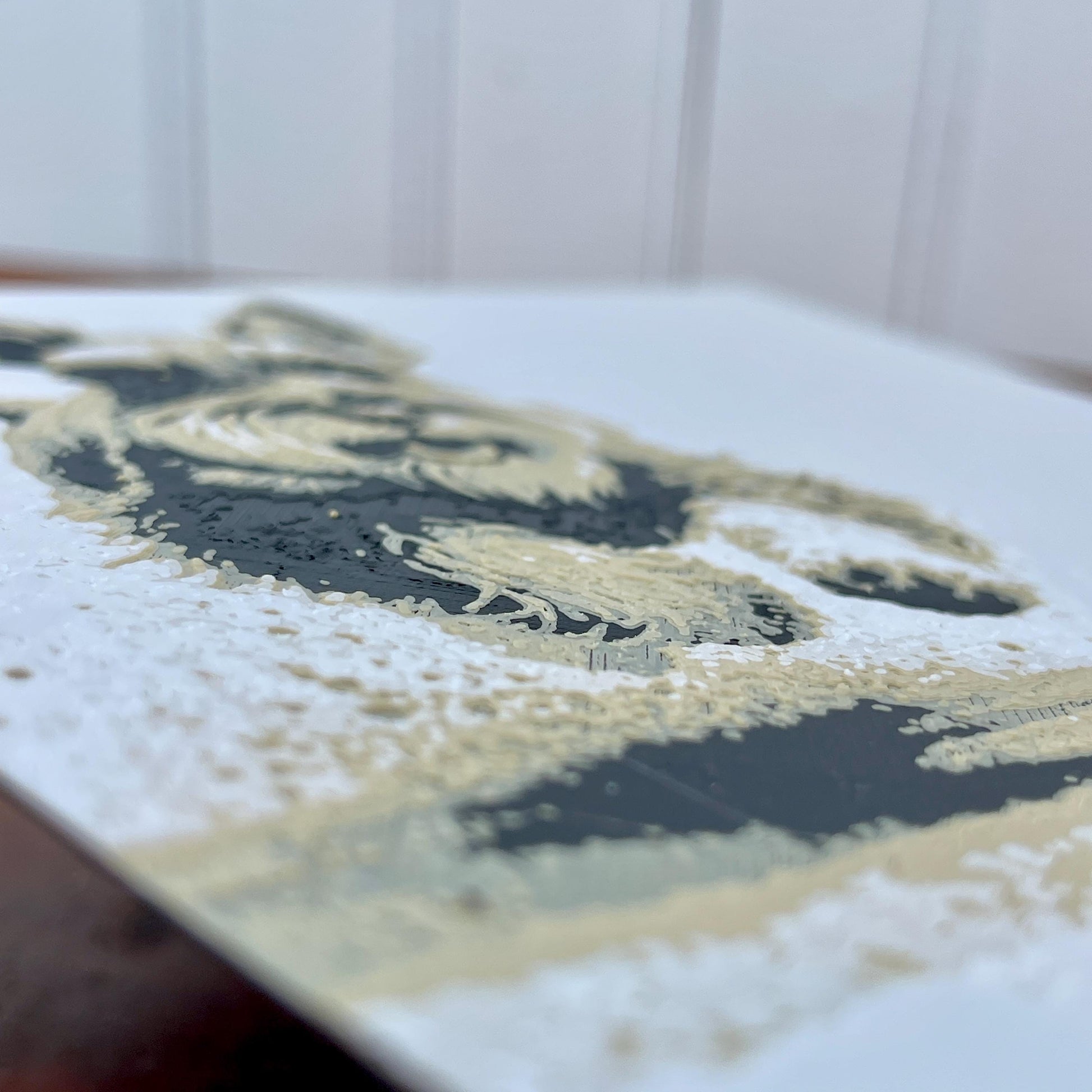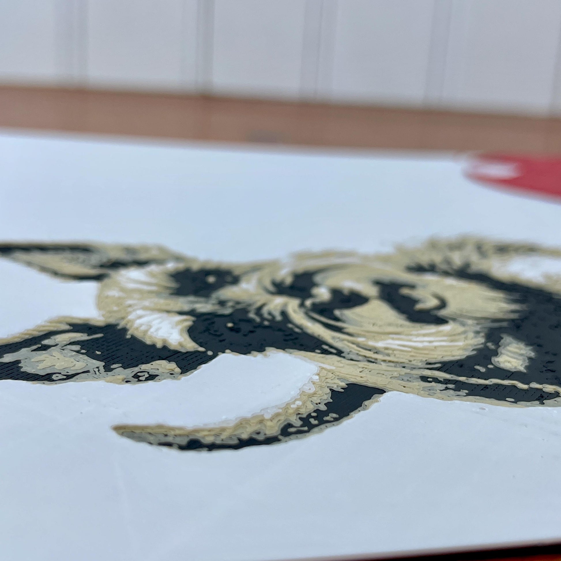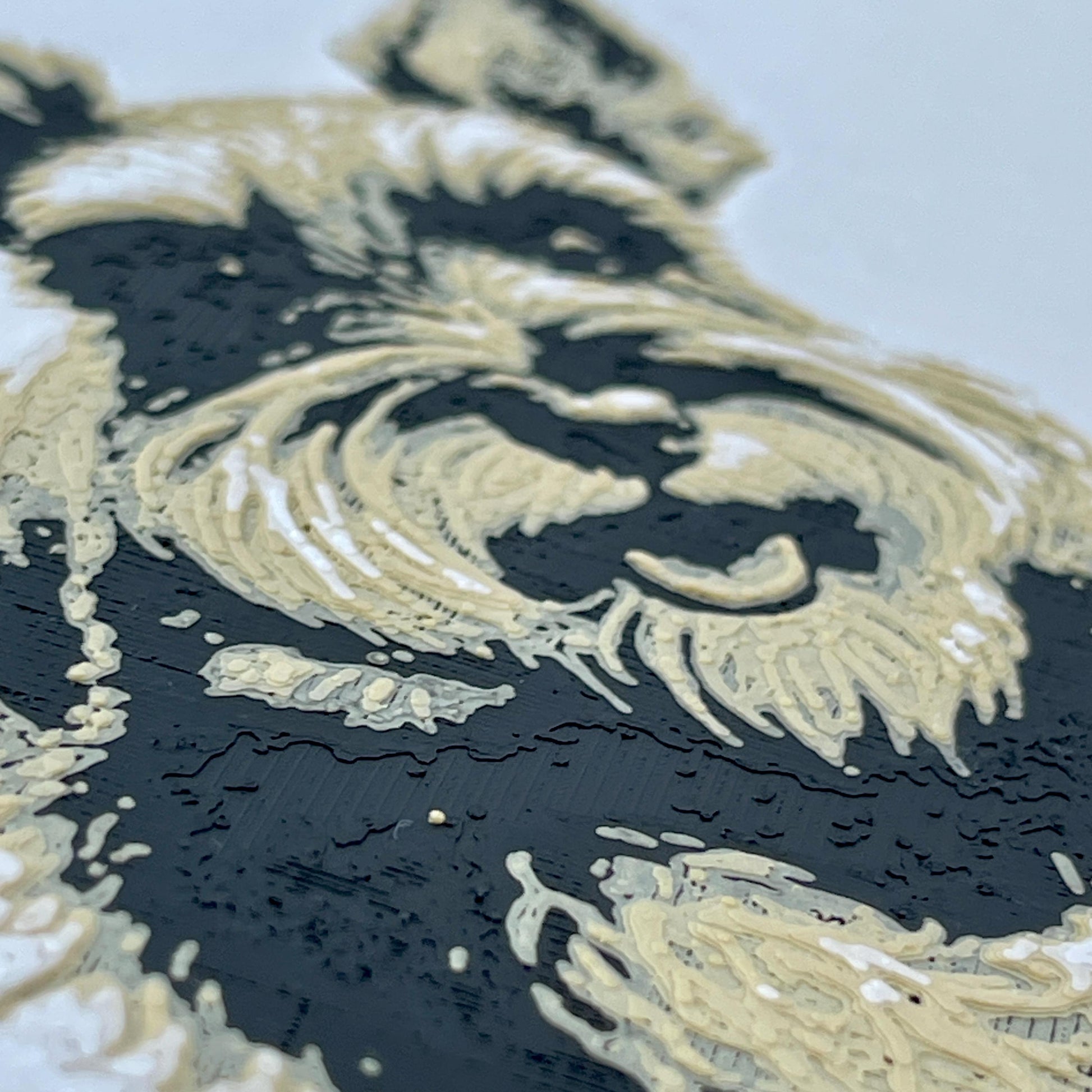 Adorable 3D printed art of a Schnauzer chasing a red ball. You can just see the joy in the pups face as he's chasing the ball. The texture and detail is bound to be a conversation starter.