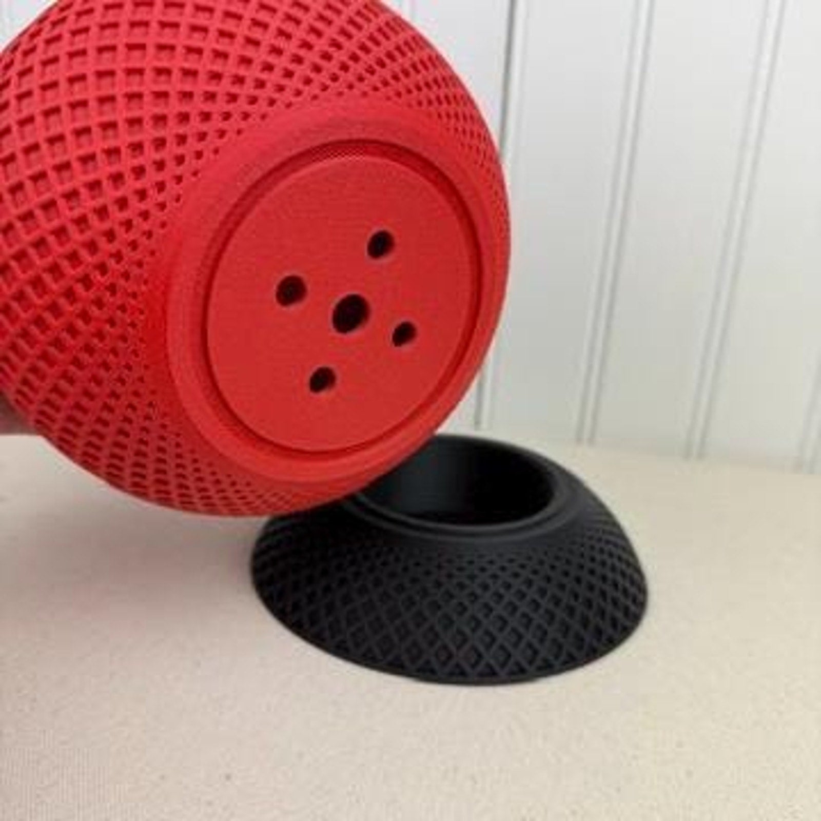 Add a bold modern accent to your space with this red 3D printed planter, featuring a striking diamond lattice texture and a coordinating elevated drip tray. The sculptural design catches the light beautifully, making it an eye-catching addition to desks, shelves, and window sills alike.