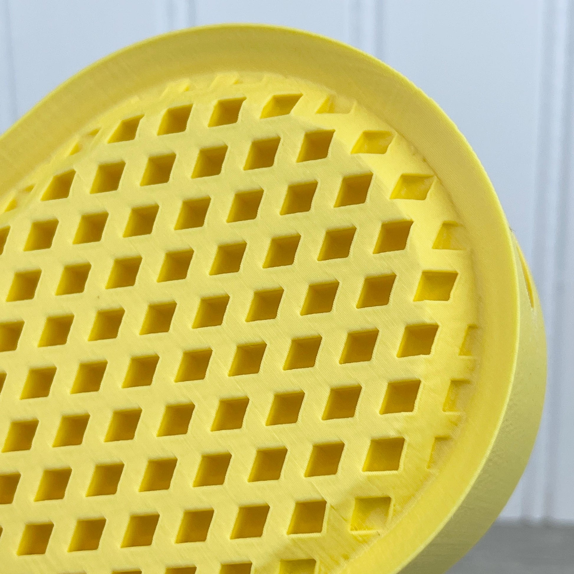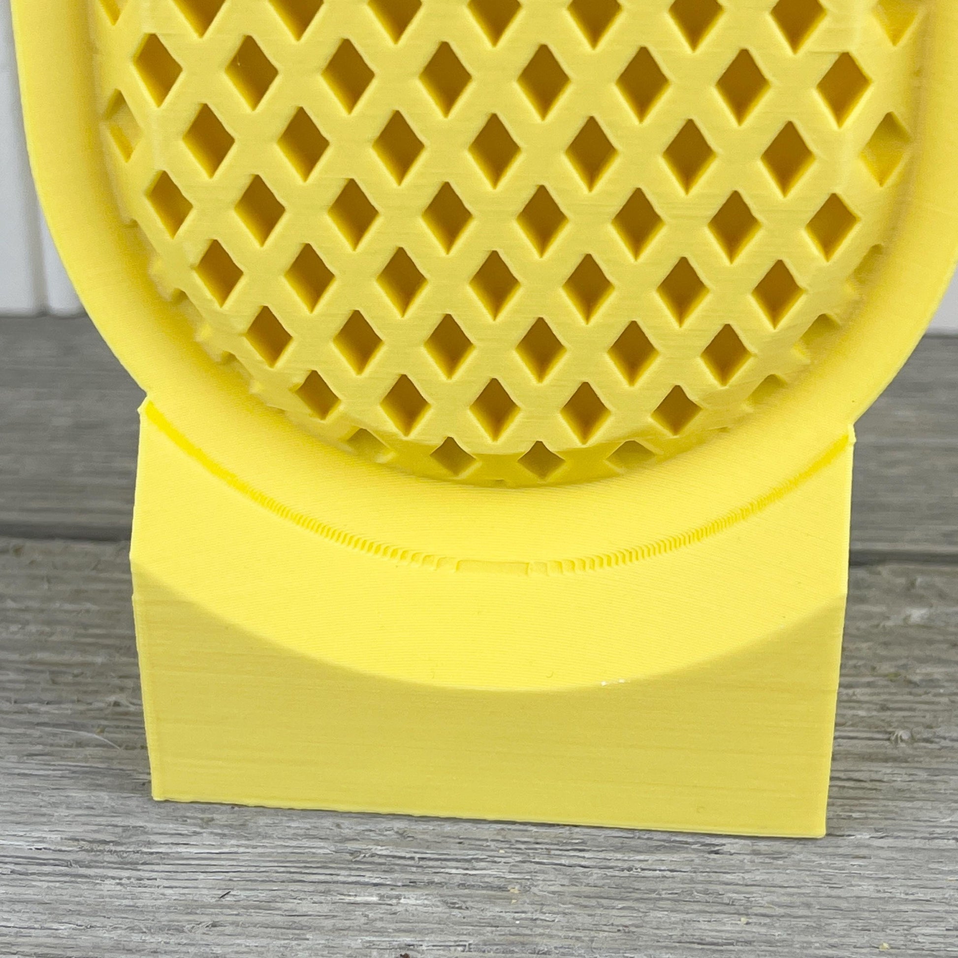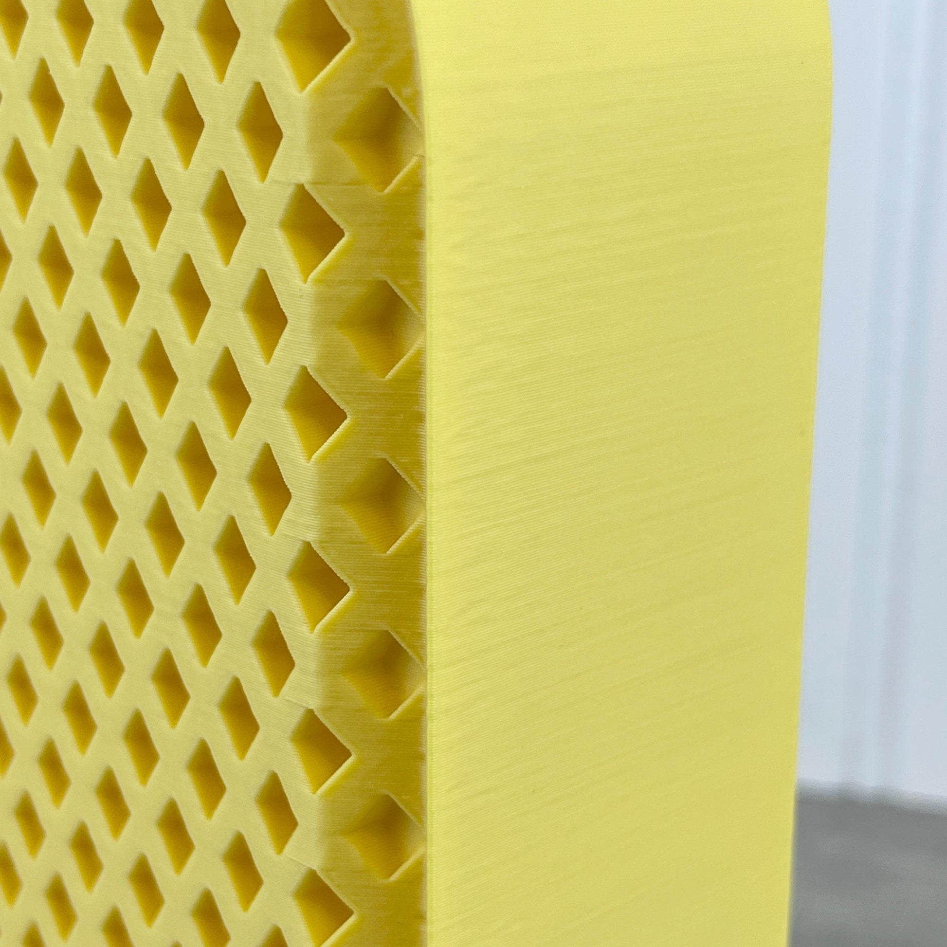 The vase is 3D printed using PLA plastic filament. 3D printing is done by printing layer upon layer of filament to build up and create the print.